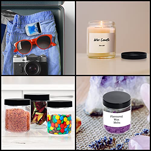 VETRO DI ALTA QUALITÀ: I set barattolo vetro hanno un pratico fondo interno piatto e un comodo design rotondo trasparente, che li rende facili da maneggiare. Sono dotati d'un esterno cristallino con un'elevata chiarezza, che consente di ispezionare e accedere rapidamente al contenuto. Il vetro spesso e resistente permette di personalizzarli facilmente con adesivi o etichette. Sono dotati di ampie aperture, per svuotarli e riempirli facilmente. Sono anche facili da pulire e riutilizzare.