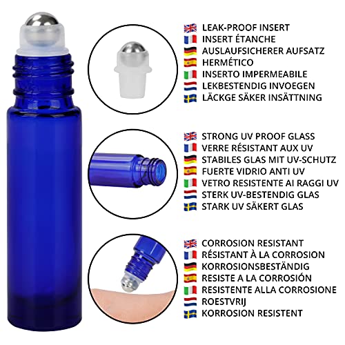 VETRO BLU REALE: I flaconi 10 ml blu cobalto proteggono gli oli essenziali dai dannosi raggi UV per salvarli dalla rapida volatilizzazione e degradazione, impedendo agli oli di perdere la loro efficienza altrettanto rapidamente. I botticini vetro sono di alta qualità e realizzate in vetro spesso che le rende lisce e antiurto. Le bottiglie sono in vero vetro blu e non verniciate, il che significa che puoi usarle con solventi e il vetro non è influenzato da oli forti come gli agrumi.