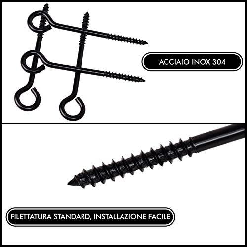 ACCIAIO INOSSIDABILE 304: Realizzato in acciaio inossidabile 304 nero di alta qualità, questo gancio e occhiello è estremamente durevole/resistente. Il materiale ha un'elevata durezza, non è tossico ed è resistente all'acqua. Inoltre, l'acciaio inossidabile non arrugginisce ed è resistente alla corrosione, ottime per esterni, uso industriale e possono resistere all'uso quotidiano. Resistono a pioggia, neve o umidità elevata. Inoltre, puoi attaccarli/rimuoverli secondo necessità.