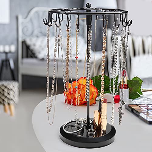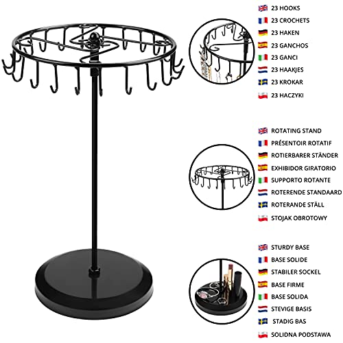 PORTA GIOIELLI: Il nostro porta gioielli donna rotante a un livello presenta ganci da 23 x 26 mm. Il supporto nero è realizzato in metallo. Nella parte inferiore dell'albero porta gioie c'è una base robusta e stabile. Questa base ha un diametro di 15,3 cm e un'altezza di 2,3 cm. L'altezza totale del supporto è di 34,8 cm e, la parte superiore, ha un diametro di 20,5 cm. È richiesto il montaggio. I dadi di fissaggio sono inclusi.
