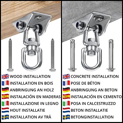 GANCI RESISTENTI: Questo gancio muro/gancio soffitto in acciaio inossidabile è perfetto per appendere qualsiasi attrezzatura di sospensione pesante o decorazioni per la casa. Il nostro set è composto da 1 gancio inox girevole, 1 gancio attaccabili, 2 viti e 2 viti ad espansione. La piastra principale misura L4 x L7 x A9,6 cm, mentre il gancio misura L8 x L4 cm. Per le dimensioni complete, fare riferimento all'immagine 2. Il robusto supporto oscillante regge fino a 400 kg.