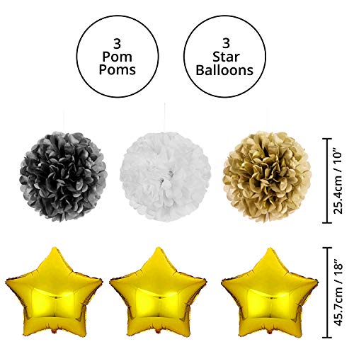 DECORAZIONI PON PON IN CARTA: Per aggiungere ulteriori addobbi per feste di compleanno alla tua festa, ci sono 3 pon pon di carta all'interno del kit. I 3 colori inclusi sono nero, bianco e oro. Possono essere appesi o disposti su tavoli. Al momento della consegna, i pon pon saranno piegati e possono essere assemblati rapidamente e facilmente. Per prima cosa, smazzare e separare la carta e stringere la cravattina al centro. Apri gli strati per ultimarli. Le istruzioni sono incluse.