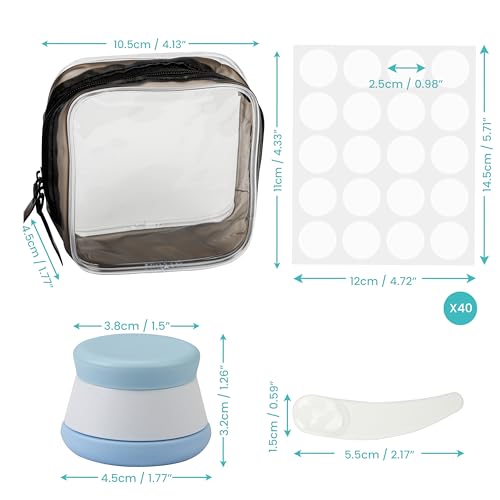 SET DI 5 VASETTI PER COSMETICI: questo set è composto da 5 porta creme da viaggio in silicone di vari colori, 40 etichette adesive rotonde bianche, una custodia in plastica trasparente per il trasporto e una mini spatola;