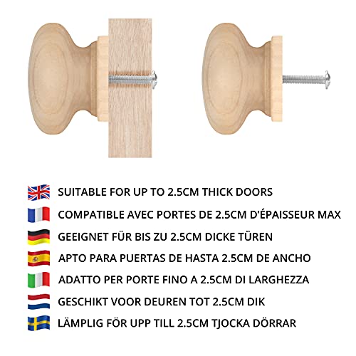 20 MANIGLIE LEGNO: In questo set sono incluse 20 maniglie per finestre in legno di schima di prima qualità. Questi pomelli legno per mobili sono alti 2,5 cm, la testa ha un diametro di 3,4 cm e la base di 2,6 cm. La base presenta un foro per vite per il fissaggio delle maniglie e può supportare viti con un diametro di 4 mm. Questo set include 20 anche viti lunghe 2 cm per il fissaggio. Puoi montare queste maniglie per armadio legno su porte con uno spessore massimo di 2,5 cm.
