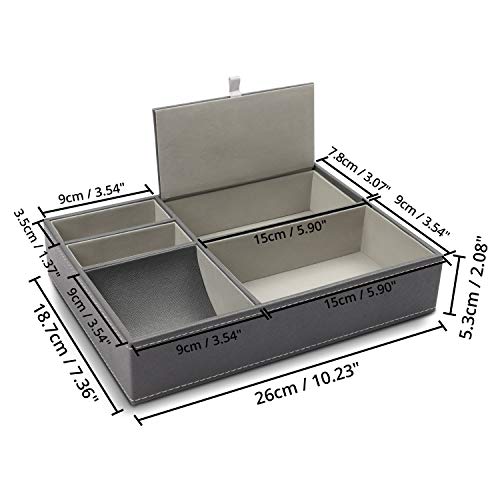 VASSOIO SVUOTATASCHE IN PELLE GRIGIO: Il nostro svuotatasche pelle misura 26 x 18,7 x 5,3 cm. Dispone di 5 scomparti in totale. Nel nostro svuotatasche moderno ci sono 2 piccole sezioni che misurano 3,5 x 9 cm, uno scomparto con un coperchio da 7,8 x 15 cm, una sezione curva facile da afferrare che è 9 x 9 cm e una sezione extra large di 9 x 15 cm.