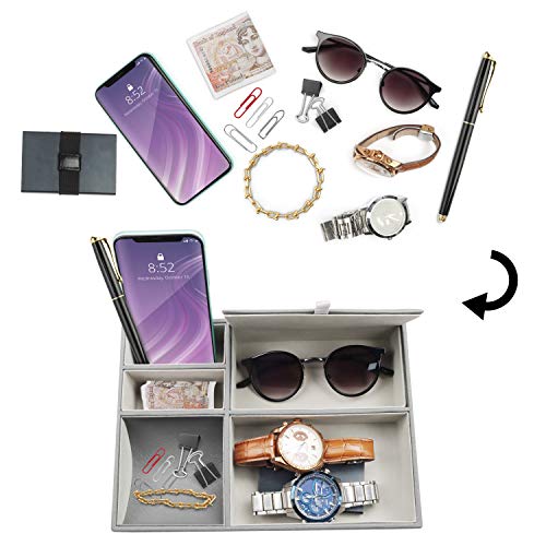 SCOMPARTI FUNZIONALI: Gli scomparti del porta gioielli uomo sono progettati pensando alla funzionalità. Le 2 fessure sottili sono della dimensione perfetta per smartphone, telecomandi e portafogli. Manterranno i tuoi dispositivi in posizione verticale in modo che siano facili da afferrare. Il coperchio protegge i tuoi oggetti di valore o farmaci da polvere, bambini o animali domestici. Riponi occhiali, gioielli e orologi. La sezione curva ti consente di afferrare facilmente piccoli oggetti.