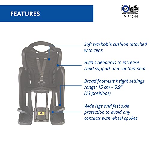 SEGGIOLINO POSTERIORE - Per bambini fino a 22 kg di peso, da 3 fino a 8 anni di età. Compatibile con ruote della bicicletta di raggio 26'' - 28''. Si può usare anche con e-bike.