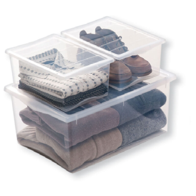 Scatola multiuso trasparente in plastica salvaspazio con coperchio;