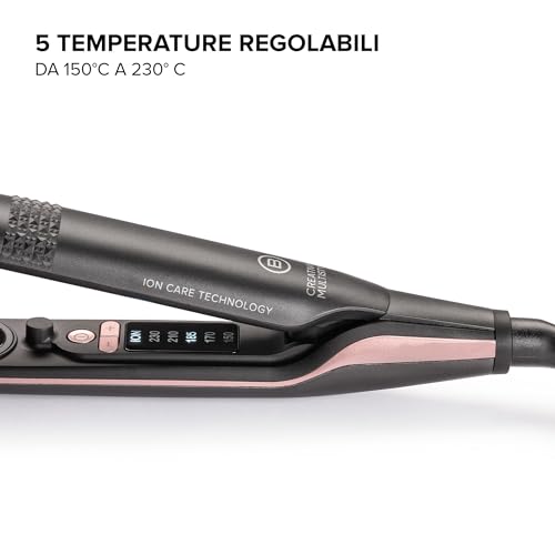 5 temperature regolabili in base al tipo di capello: 150°C, 170°C, 185°C, 210°C, 230°C per ottenere lo styling desiderato nel rispetto dei capelli;