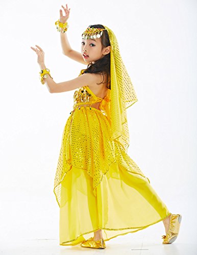 BellyQueen Belly Dance Ragazze Set 7 Pezzi Top Gonna Accessori Costume Vestito Indiano Danza per Carnevale di Halloween Spettacolo Dress Costume Danza del Ventre Orientale 5-8 Anni Giallo