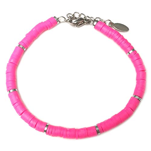 Beloved Bracciale Summer Vibes con rondelle in gomma colorate e dettagli in acciaio - regolabile fino a 20 cm con moschettone - Colori vivaci (Fucsia, Colore Silver)