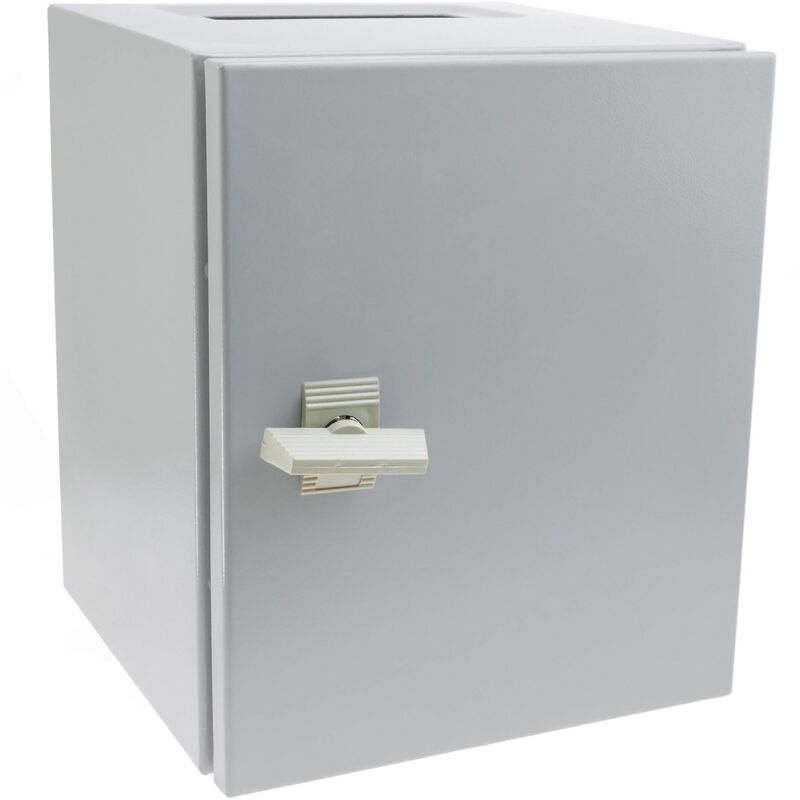 Scatola di distribuzione elettrica montata a parete. Di design tipo armadio in metallo con porta. Protezione ambientale IP65, che consente di installare la scatola di distribuzione all'esterno. Scatola completamente vuota, tranne una lamiera di montaggio fissata al fondo dell'armadio. Ottima qualità e molto robusto. Specifiche Dimensioni (altezza x larghezza x profondità): 300 x 250 x 250 mm. Cassa di distribuzione realizzata in acciaio di spessore 1,2 mm. Verniciata in colore beige. Dispone di una chiusura a un quarto di giro. Viene fornita una chiave. Lamiera in acciaio zincato da 2 mm di spessore, per il montaggio di componenti elettrici. Perforazione di 130 x 50 mm per il passaggio dei cavi. Coperchio con guarnizione in gomma. Guarnizione in gomma su tutto il profilo della porta per garantire la tenuta. Protezione ambientale IP65, contro umidità e acqua. .