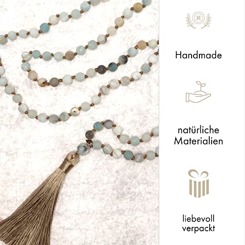 Una fantastica collana di perle di amazzonite selezionate a mano. Questo gioiello è lavorato con amore e irradia armonia e serenità con le sue pietre preziose opache. In coordinato con le perle abbiamo inserito un nappa luccicante in oro come elegante punto luce.