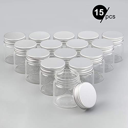 BENECREAT 15PCS 50ml Bottiglie di Vetro Trasparente con Tappo a Vite in Alluminio con 2 Fogli di Etichette per Erbe Aromatiche Piccoli Oggetti Bomboniere per Matrimoni