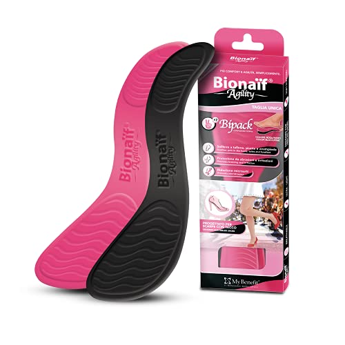 CONTENUTO - A casa riceverai la confezione Bipack di Sottopiede Bionaif Agility Rosa + Nero, prodotto che garantisce un appoggio extra morbido e sollievo a tallone, pianta ed avampiede. Il suo materiale soffice riduce i microurti e protegge da abrasioni ed irritazioni. Il lattice traspirante permette al piede, di rimanere sempre fresco ed asciutto. Ideale per piedi sofferenti con scarpe a tacco alto e per le donne che sono sempre in piedi, in movimento con calzature molto alte