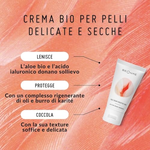 BeOnMe - Crema Viso Pelli Delicate, Sensibili, Naturale, Biologica, Vegana, Idratante, Lenitiva, Protettiva, Acido Ialuronico, Aloe, Donna, Uomo, 50 ml