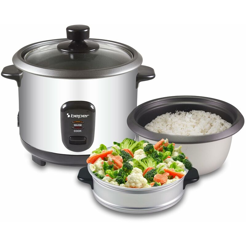 Pentola a vapore/Cuoci Riso, Corpo in acciaio, recipiente per cottura in alluminio antiaderente, rimovibile Capacità del recipiente da 1 litro per, coperchio di vetro trasparente, pareti fredde al tatto Sistema di mantenimento del calore, indicatore luminoso di funzionamento 1