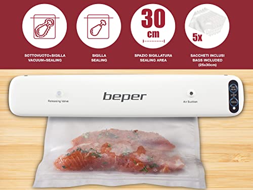 BEPER P102CON001 Macchina sottovuoto,Sigillatore Sottovuoto con 5 Sacchetti Sottovuoto, ABS, Duplice Funzionamento, Nastro Sigillante da 30 cm, Bianco/Grigio