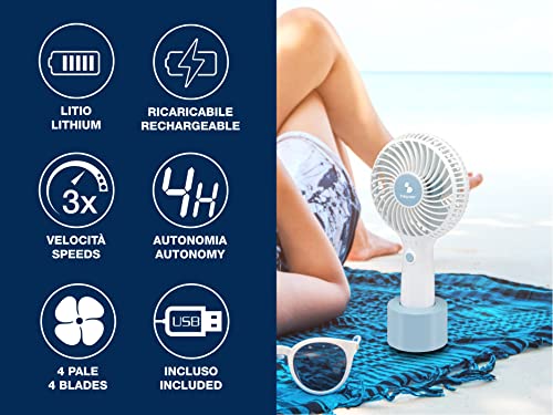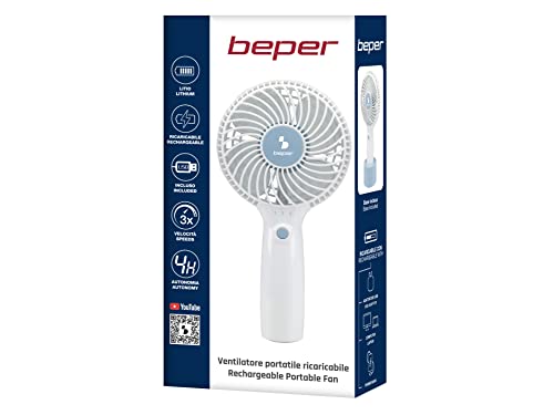 Beper P206VEN400 Mini Ventilatore Portatile Ricaricabile, 3 Velocità, Base d'Appoggio e Cavo di Ricarica Inclusi, Salvaspazio, Silenzioso, Mini Portable Fan