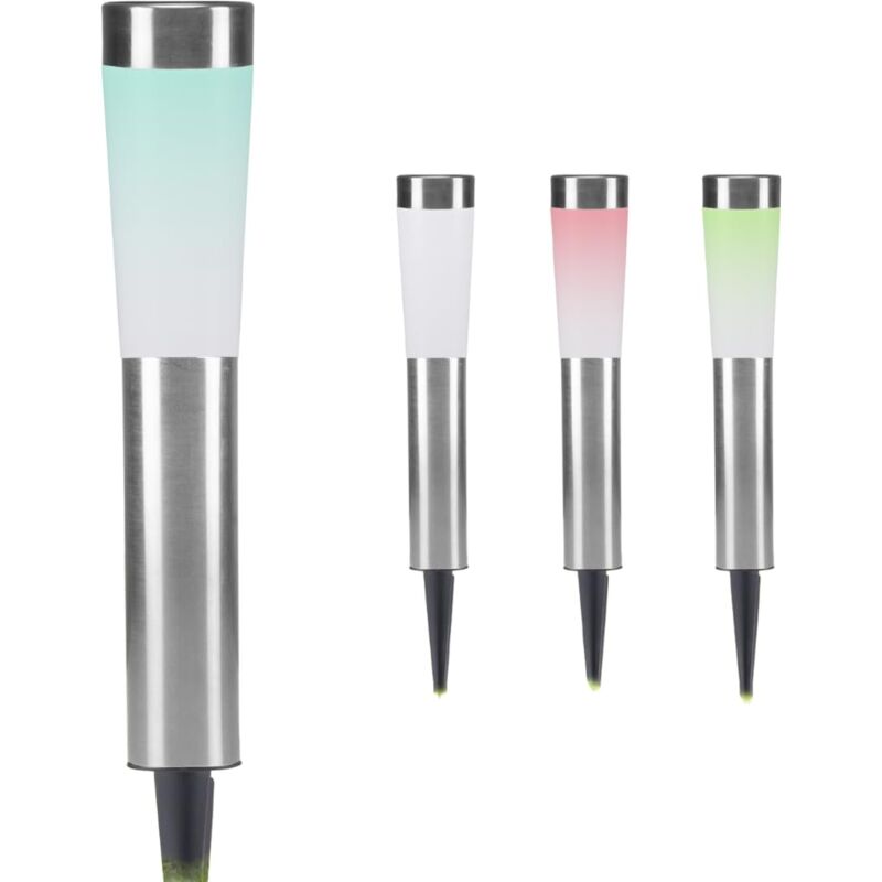 Pratica luce di orientamento per giardino e balcone comprensiva di picchetto. La lampada si accende automaticamente con il buio e si spegne con la luce del giorno, grazie all'energia che arriva dalla luce solare. Il picchetto consente di fissare la lampada al terreno in qualsiasi punto del giardino, accanto alle aiole o lungo i vialetti. 3 modalità selezionabili: luce bianca, spento, luce colorata. Corpo realizzata in acciaio e plastica, pannello solare in vetro. Tempo di ricarica: 4-6 ore. Autonomia: 6-8 ore. Batteria Ni-Mh 100 mA. Diametro: 7,5 cm, altezza totale con picchietto: 56 cm. Protezione IP44