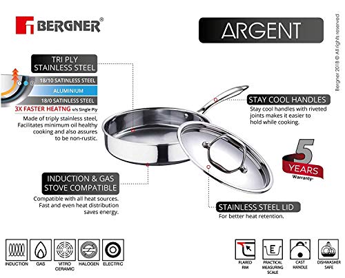 Bergner BG-6330 Argent SS - Casseruola triplica con coperchio, 26 cm, 3,1 l, in acciaio INOX
