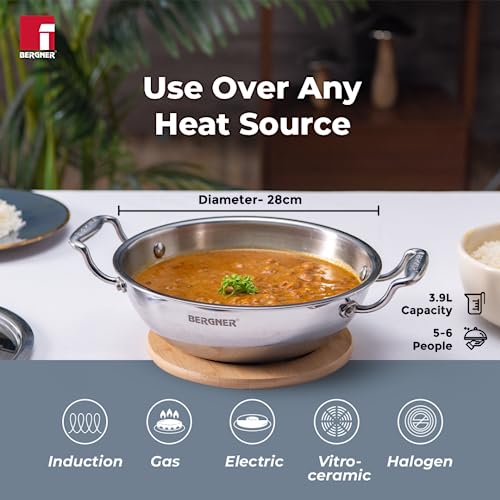 BERGNER Triply Argent Kadai con Coperchio 3,9 LTR BG-6333, Acciaio Inossidabile, 3,9 litri