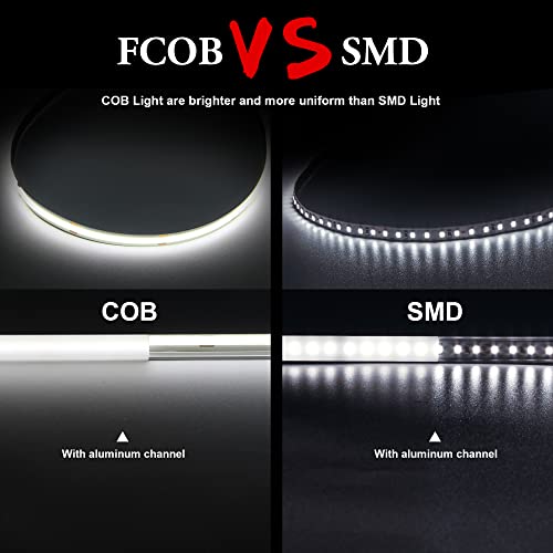 Design COB: rispetto alle tradizionali strisce led (SMD3528, SMD2835, SMD5050), queste led striscia sono COB (chip a bordo), hanno chip LED ad alta densità sulla scheda PCB adesiva. le unità emittenti sono disposte strettamente per garantire un'illuminazione uniforme e senza macchie scure per la protezione degli occhi
