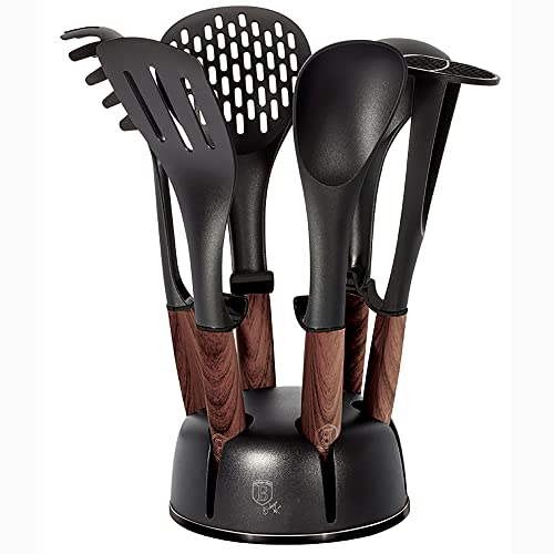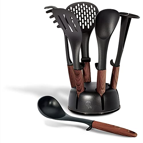 Berlinger Haus Ebony Rosewood Set di 6 utensili da cucina in nylon + supporto a 360°, antiaderenti, senza BPA, resistenti al calore, manico effetto legno