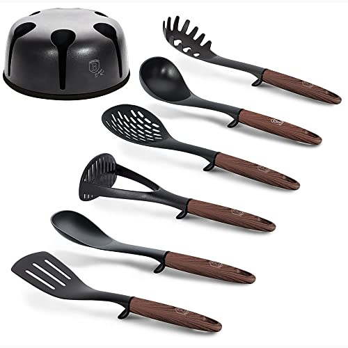 Set completo: il set include 1 spatola con fessure per capovolgere, 1 mestolo per zuppa, 1 schiumarola, 1 cucchiaio da portata, 1 server per pasta, 1 schiacciapatate e un supporto per raccogliere tutti questi utensili da cucina.