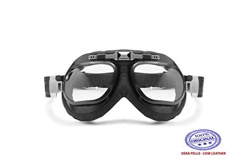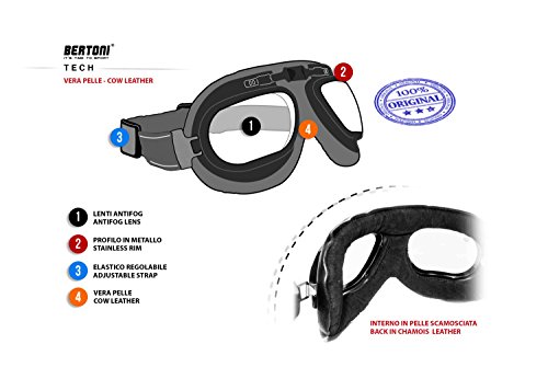 Bertoni Occhiali Moto Aviatore in Pelle - Lenti Antifog Antiappannanti - Profili in Acciao Nero Opaco - AF191L Maschera Moto Vintage per Casco Harley e Chopper