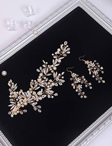 Beryuan,fermaglio per capelli da donna,con perle bianche e fiore di perle bianche,set di orecchini con cristalli dorati,accessorio per capelli,idea regalo per la sposa la damigella d'onore (oro)