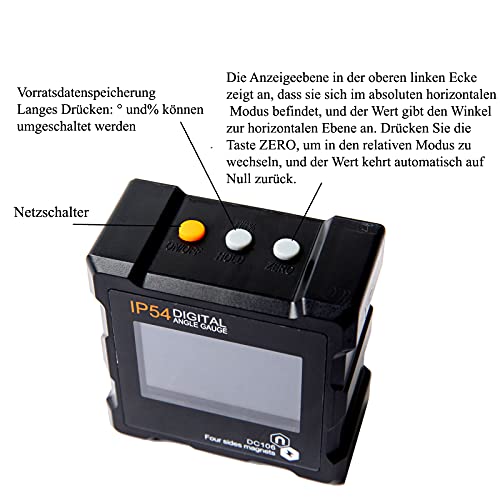 Con i magneti a 4 sfaccettature K è possibile fissare il calibro angolare a qualsiasi oggetto in acciaio. È particolarmente facile misurare l'inclinazione dell'elicottero, l'angolo di smussatura, il test dell'auto, la ecc. L'indicatore è invertito automaticamente quando la parte superiore è rivolta verso il basso.