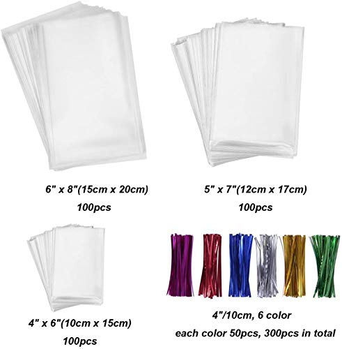 BESLIME Sacchetti da Regalo Trasparenti, 300 Pezzi Sacchetti da Regalo in cellophane Trasparente (10 x 15 cm, 12 x 17 cm, 15 x 20 cm) con 300 Pezzi di Legature a Spirale da 10 cm 6 Colori Misti