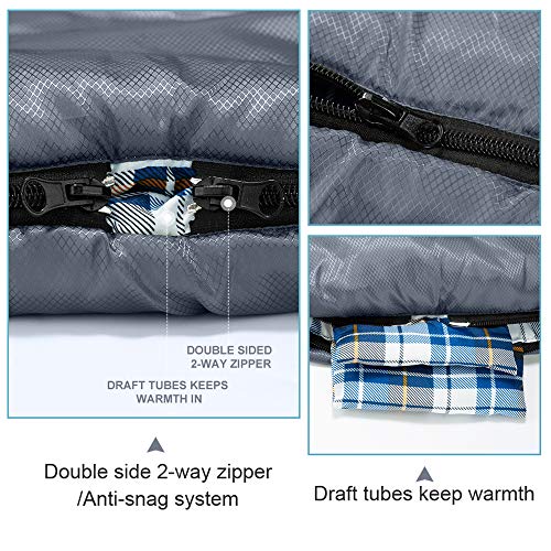 [ LIBERA E TIENI AL CALDO ] Il sacco a pelo doppio ha una cerniera liscia anti-intoppo a sinistra ea destra per facilitare l'entrata e l'uscita. Ci sono due strisce antivento nella parte inferiore, che possono bloccare il vento e mantenere i nostri piedi caldi per lo zaino in spalla, il campeggio, l'escursionismo, i viaggi. Inoltre, se vuoi che i tuoi piedi siano liberi, puoi anche aprire le cerniere.