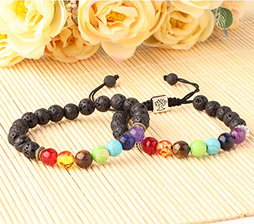 BESTEEL 2PCS 7 Chakra Stone Bracciale per Uomo Donna Diffusore Bracciale Albero della Vita Mala Stone Lava 8mm, Elastico