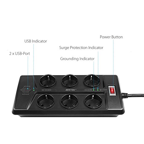 BESTEK Multiprese Elettriche con usb, Multipresa Ciabatta 6 posti, Presa Multipla Protezione per Bambini, Ciabatta 16A 1.8m Cavo di alimentazione,Ciabatte Elettriche EU MRJ6402