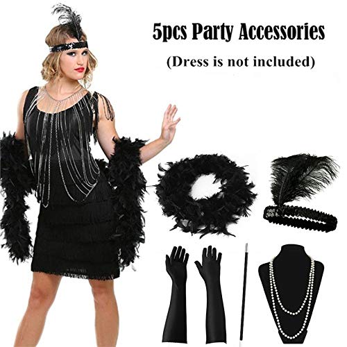 Pacchetto include: totale 5 pezzi, cerchietto di piume, guanti lunghi neri, boa di piume nere etc. (Il vestito non è incluso)