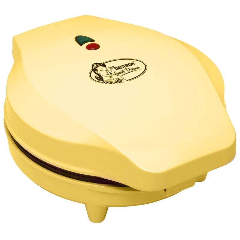 La piastra per waffles ASW217V fa parte della linea Bestron Sweet Dreams e sarà un ottimo partner per la vostra attività di creazione di waffles fatti in casa. È dotata di un alloggiamento resistente al calore, meccanismo di avvolgimento del cavo, rivestimento antiaderente e una temperatura controllata automaticamente con due spie luminose. Questa macchina per waffle può essere riposta verticalmente per risparmiare spazio di stoccaggio. Con questa macchina per waffle, potete facilmente preparare waffle a forma di cuore per la colazione o l'ora del tè! Sono incluse diverse ricette gustose come riferimento. Colore: Giallo Materiale: Plastica Dimensioni: 25,5 x 25 x 9,5 cm (L x P x A) Potenza: 700 W Alimentazione: 220-240 V~, 50/60 Hz Rivestimento resistente al calore Rivestimento antiaderente Controllo automatico della temperatura Luce che indica quando la piastra è pronta per l'uso e spia luminosa Può essere riposta in verticale per occupare meno spazio Avvolgimento pratico del cavo