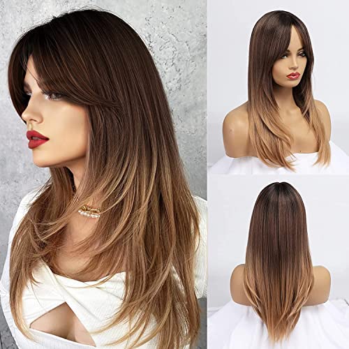 BESTUNG Parrucca marrone da donna, lunga capelli sintetici naturali, parrucca da donna, fibra dorata chiara, resistente al calore
