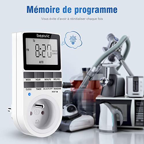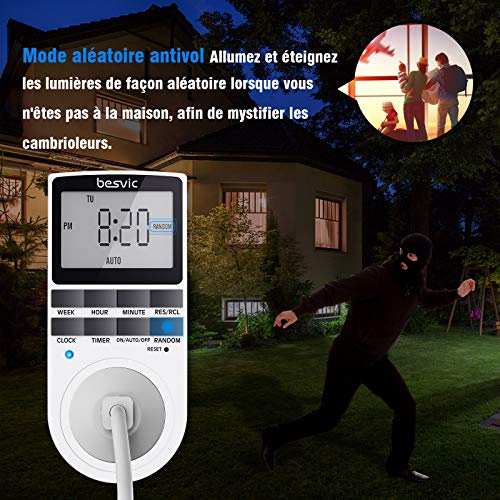 Besvic - Programmatore presa elettrica, presa programmabile digitale a 10 programmi giornalieri settimanali con grande schermo LCD e modalità anti-furto, risparmio energetico per la casa (2 pezzi)