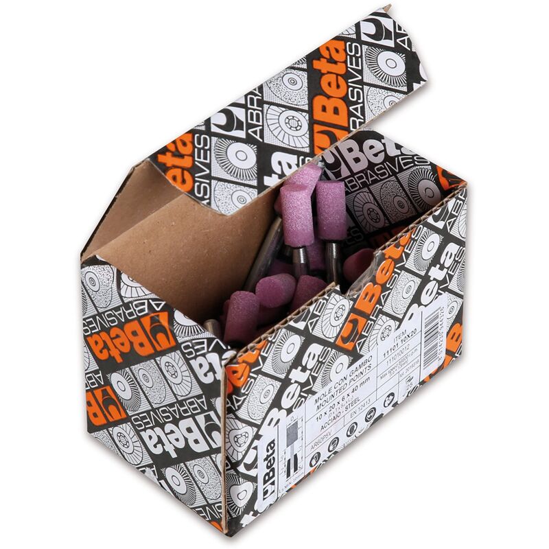 Descrizione Mole abrasive con gambo. Granuli abrasivi di corindone rosa con legante ceramico. Forma cilindrica.