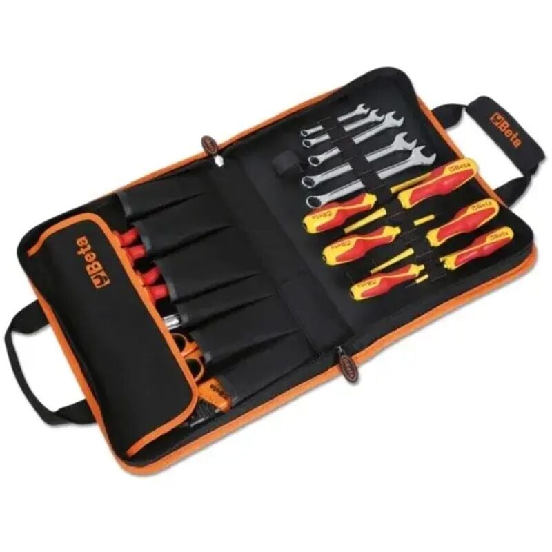 La valigetta pieghevole con assortimento 24 Pz. 020010154 Beta 2001/BZ24 MQ è una valigetta in tessuto ad alta resistenza completa di dotazione di utensili per elettricisti.Questa valigetta in tessuto richiudibile è dotata di doppia maniglia superiore per una presa ottimale, fascia in velcro per fissare la valigetta, 20 pratici vani porta utensili (14 elastici e 6 tasche), asola porta martello, ampia tasca frontale porta documenti con chiusura a zip.Inoltre questa valigetta dispone della predisposizione per applicare la tracolla Beta C9/RT non inclusa in dotazione ed acquistabile separatamente La valigetta Beta 2001/BZ24 MQ è fornita con dotazione da 24 pezzi, nello specifico:- 1x Beta 1128BMX Forbici per elettricisti a lame dritte- 1x Beta 1150MQ pinza universale 1000 V 180 mm- 5x Beta 42 Chiavi combinate da 8 - 10 - 13 - 17 - 19 mm- 3x Beta 1274MQ Cacciavite a lama parallela 1000 V misure 3x100 - 4x100 - 5,5x125 mm- 3x Beta 1272MQ Cacciavite Phillips 1000 V misure PH0x60 - PH1x80