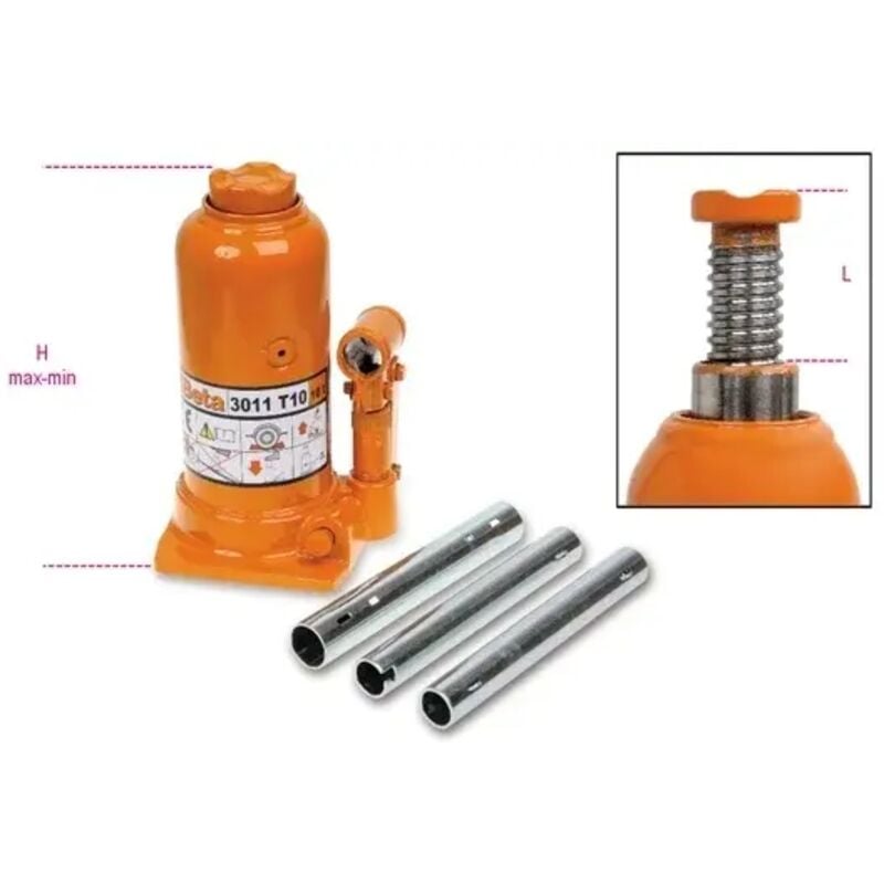 Il sollevatore idraulico a bottiglia Beta 3011/T è un dispositivo di sollevamento professionale.Questi strumenti permettono di sollevare carichi di vario genere in base al modello, con portate comprese tra le due e le venti tonnellate di carico statico. Realizzato con valvola di sicurezza integrata in caso di sovraccarico, pistone con prolunga a vite per la regolazione della posizione di alzata e leva a 3 sezioni per garantire lavorazioni agevoli anche in caso di spazio limitato.I sollevatori idraulici Beta 3011/T sono disponibili in differenti varianti in base alle proprie necessità operative. Tipologia: Sollevatore idraulico Tipo: A bottiglia Portata: 2 - 20 T Utilizzo: Professionale