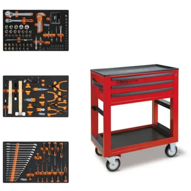 Il carrello di servizio con assortimento utensili 189 Pz. Beta BW 5000S/3M è l'occasione ideale per professionisti ed hobbisti che vogliono completare l'arredo di officine o garage, assicurandosi un prodotto robusto e durevole completo di una ricca dotazione di utensili manuali universali della linea Beta Worker.Realizzato con piano di lavoro termoplastico offre carico statico fino a 400 kg ed è predisposto con 3 pratici cassetti da 588x367 mm con altezza 70 mm e portata di 15 kg, montati su guide telescopiche a sfera e dotati di tappetini in gomma espansa, potrete riporre con praticità i vostri utensili in assoluta sicurezza grazie alla chiusura centralizzata.Il carrello C50S, acquistabile in 3 varianti di colore a seconda delle esigenze di arredamento, è disegnato con ripiano inferiore e integrato con 2 porta flaconi laterali e praticissimo porta cacciaviti laterale incluso.Grazie alle ruote, di cui due girevoli ed una con freno, potrete movimentarlo con