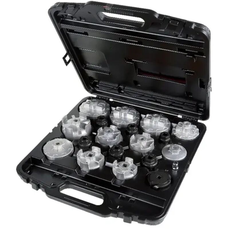 Serie di 18 chiavi a bussola per filtri olio Particolarmente indicate per auto asiatiche Misure incluse nella serie: Ø mm N lati 63-64 14 66,5 14 74 14 79 15 84 14 87 16 92 15 94,5 15 100,5 15 64,5 14 a settori per Toyota 64,5 14 a settori per Lexus N° 6 bussole esagonali misura 24-27-30-32,5-36-38 mm per cartucce filtro Il kit include 1 chiave regolabile universale Ø 58÷93 mm Dimensioni scatola: 490x450x60 mm Peso: 4 kg