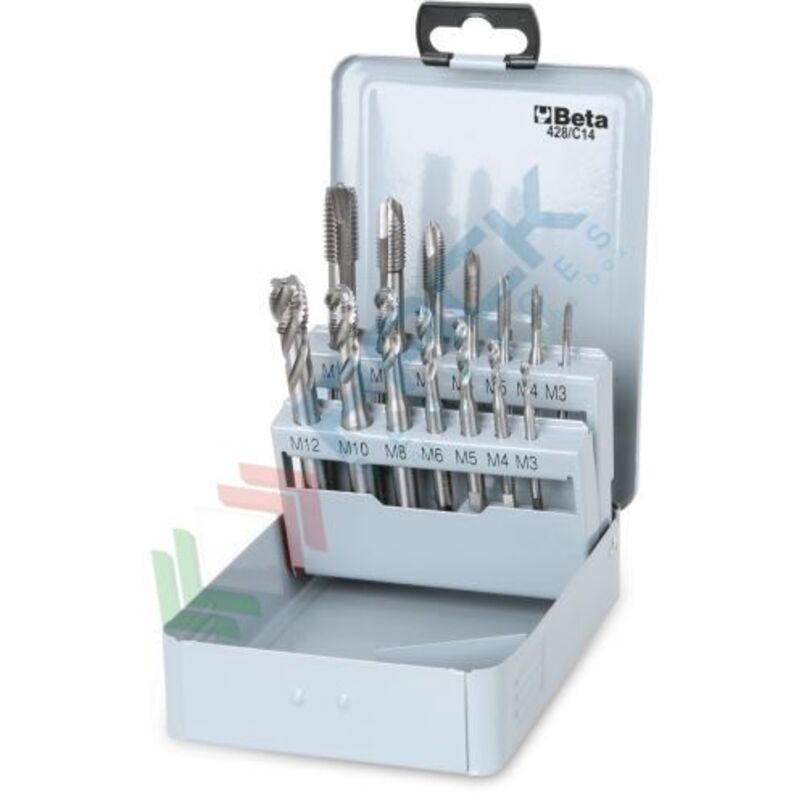 Assortimento di 14 maschi a macchina 428fp+428fc. Tipologia: Macchina Modello: Passaggio singolo Passo: Grosso Materiale: Acciaio hss Utilizzo: Fori ciechi e passanti Certificazione: Iso 529 Contenuto serie: 428fp m3-12 / 428fc m3-12 Pezzi per confezione: 14 Articoli correlati: Beta 428/spv