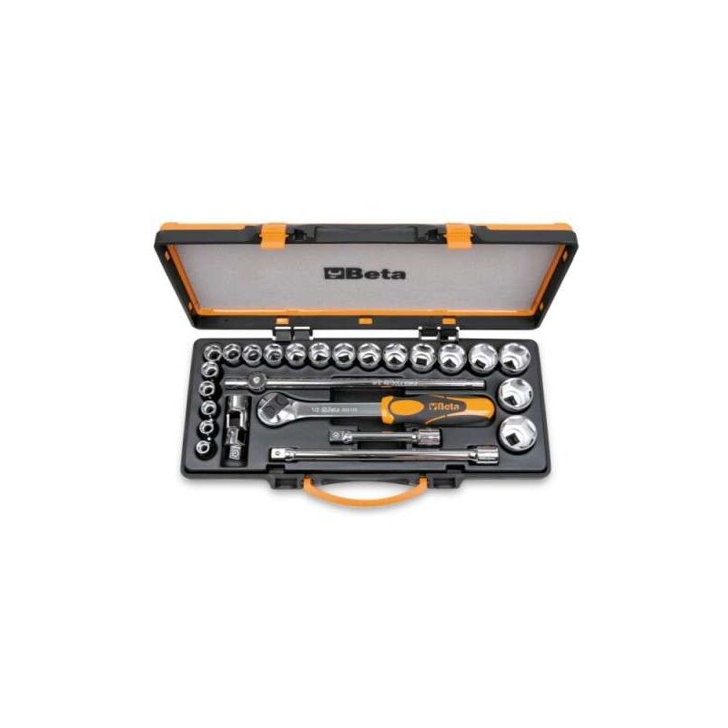 20 chiavi a bussola esagonali e 5 accessori in cassetta di lamiera chiavi a bussola esagonali 1/2 ? 10 - 11 - 12 - 13 - 14 - 15 - 16 17 - 18 - 19 - 20 - 21 - 22 -23 24 - 26 - 27 - 28 - 30 - 32 mm prolunga - 1/2 125 mm prolunga - 1/2 255 mm snodo 1/2 quadro maschio 1/2 con spina scorrevole cricchetto con quadro scorrevole 1/2