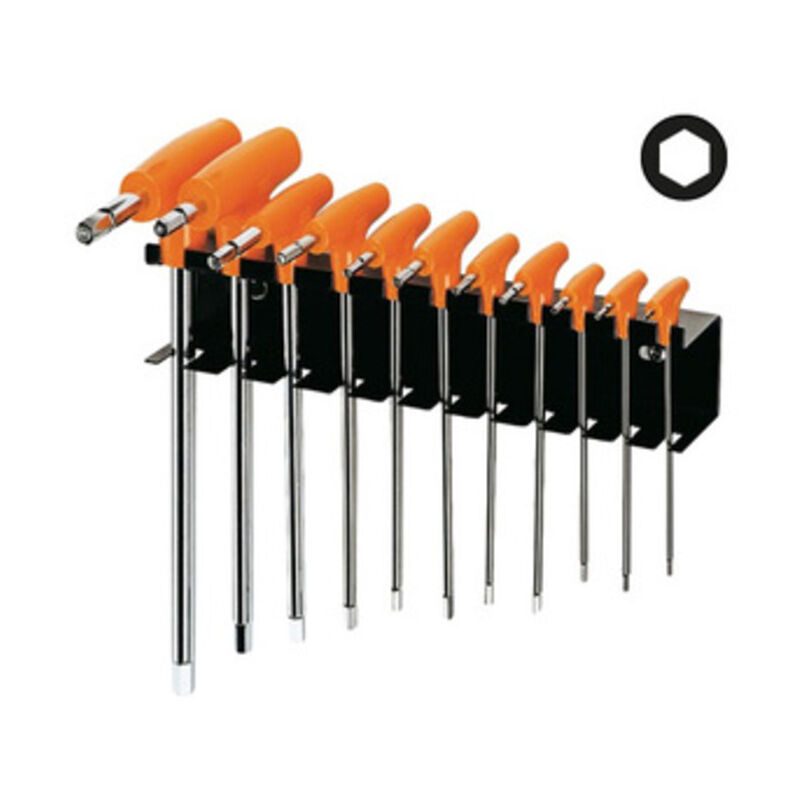 Art. 96T SP11 serie da 11 chiavi esagonali piegate cromate. Con impugnatura di manovra. Misura 2 -2,5 -3 -3,5 -4 -4,5 -5 - 6 -7 -8 -10 mm. Con supporto in lamiera.