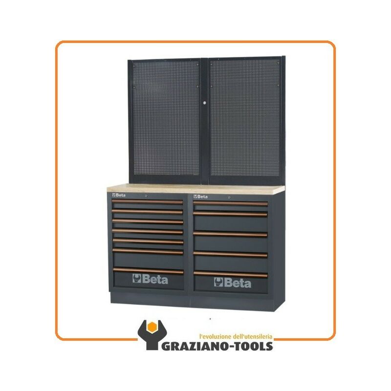 Combinazione banchi arredo officina C45PRO - Beta C45PRO BPW-1,3 Combinazione composta da: • Piano di lavoro in legno multistrato (C45PW/2-1,3MT) • Modulo fisso con 7 cassetti (C45PRO M7) • Modulo fisso con 5 cassetti (C45PRO M5) • 2 pannelli forati portautensili (C45PRO PF) • 1 staffa per parete tipo largo (C45PRO SL) • 2 staffe per parete tipo stretto (C45PRO SS) Peso: 139 kg