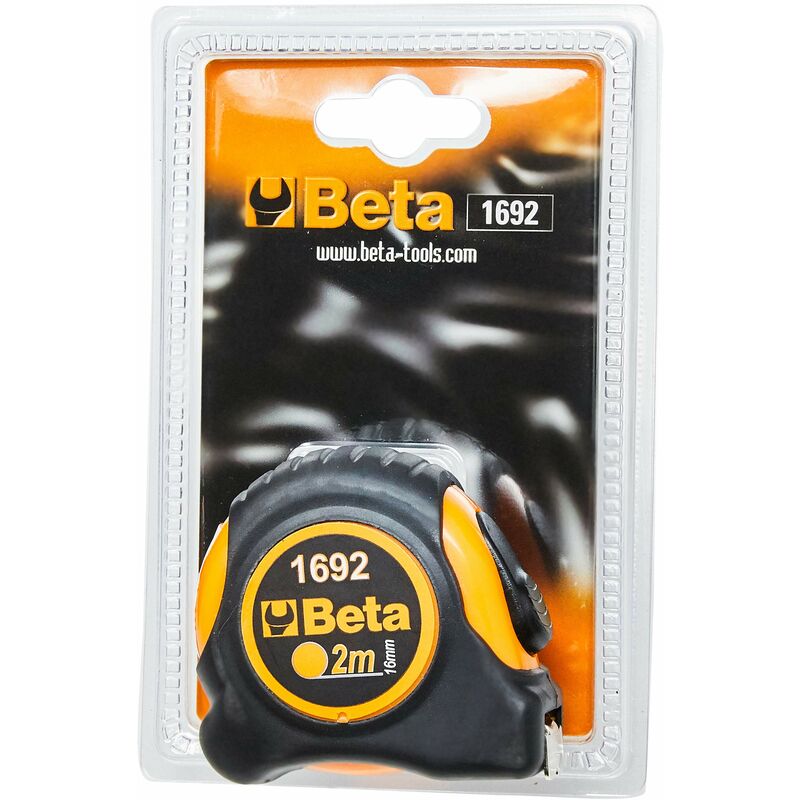 Metro a nastro compatto Beta serie 1692 con larghezza nastro di 16mm e lunghezza di 2 metri. La crescente necessità di effettuare, da parte del personale operativo, controlli dimensionali direttamente sul luogo d'intervento necessità di strumenti di misura affidabili e di grande praticità in grado di coprire le operazioni più comuni con grande precisione. Il flessometro Beta è caratterizzato da una struttura compatta che non va ad intralciare i movimenti del lavoratore. Perfetto sia per un utilizzo professionale che nelle piccole lavorazioni giornaliere di casa. La cassa in ABS antiurto ne esalta la durevolezza risultando ideale per le operazioni intensive dei cantieri edili. Dotato di sistema di bloccaggio del nastro con tasto. Costruito in conformità con le normative CE con classe di precisione II.